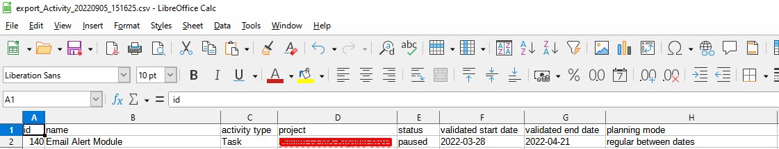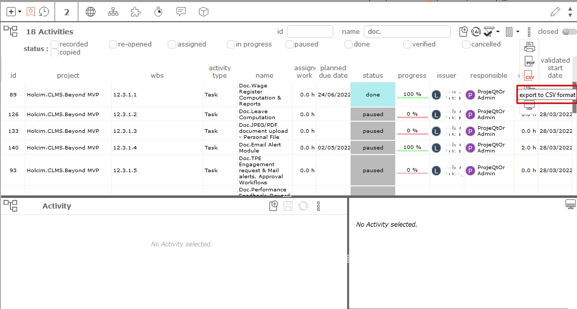 2 - In the tools of the details area, export the activities you want to modify in CSV