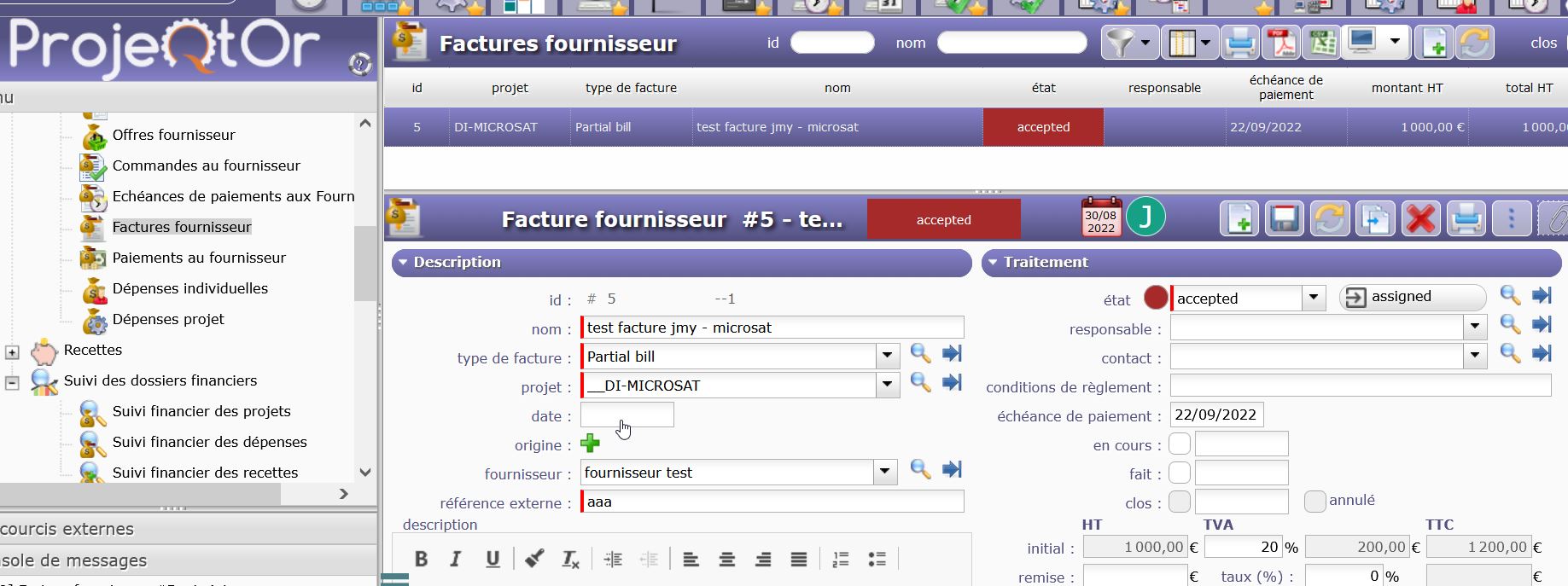 I inputted data in the expenses sections : project expenses, , individual expenses, orders to provider, provider bills