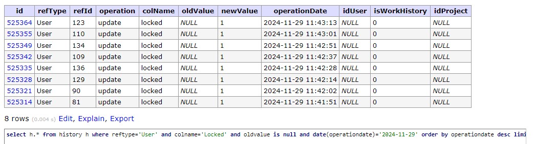 I’ve been experiencing a peculiar issue for quite some time. Occasionally, users report that their accounts are getting locked unexpectedly. Initially, I believed this was due to incorrect password attempts and advised them accordingly while unlocking their accounts.However, on November 29th, I noticed something unusual—within just five minutes, eight users’ accounts were locked simultaneously. I’ve attached a screenshot from the history table and the relevant log file for your reference.