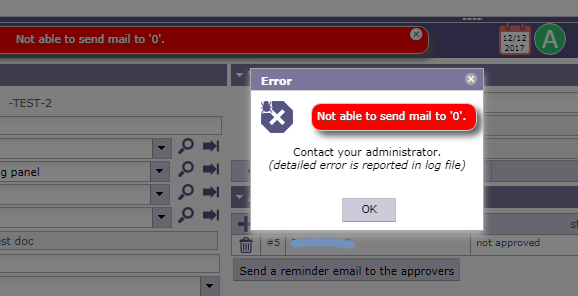 I am working on the V6.4.4 version and in a document when I press on "Send a reminder to the approvers" I am getting an error (Not able to send mail to '0') although a valid user with a valid e-mail is entered as approver. The user is normally receiving other e-mails from projeqtor.