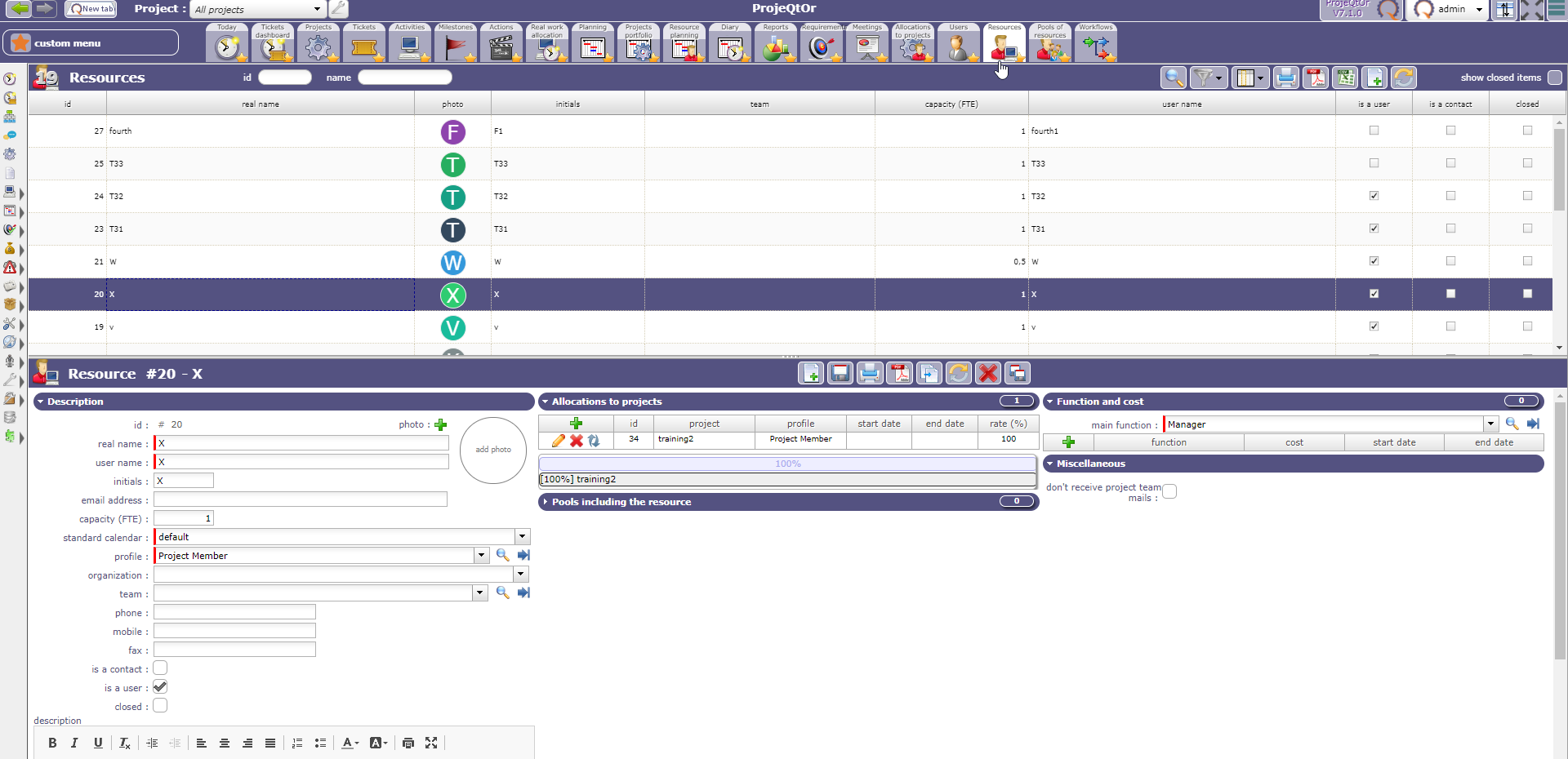 Select the resource, on détail area please fill capacity box ( FTE) . the value 1 means that the resource works all day long, O,5 indicates half a day.(opened hours)