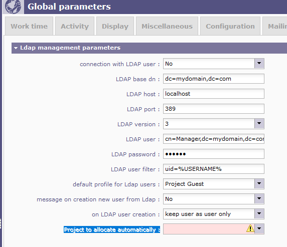 When I go to the menu "Parameters\Global Parameters", on the tab "Authentication", I have the last parameter "Project to allocate automatically" which is on error