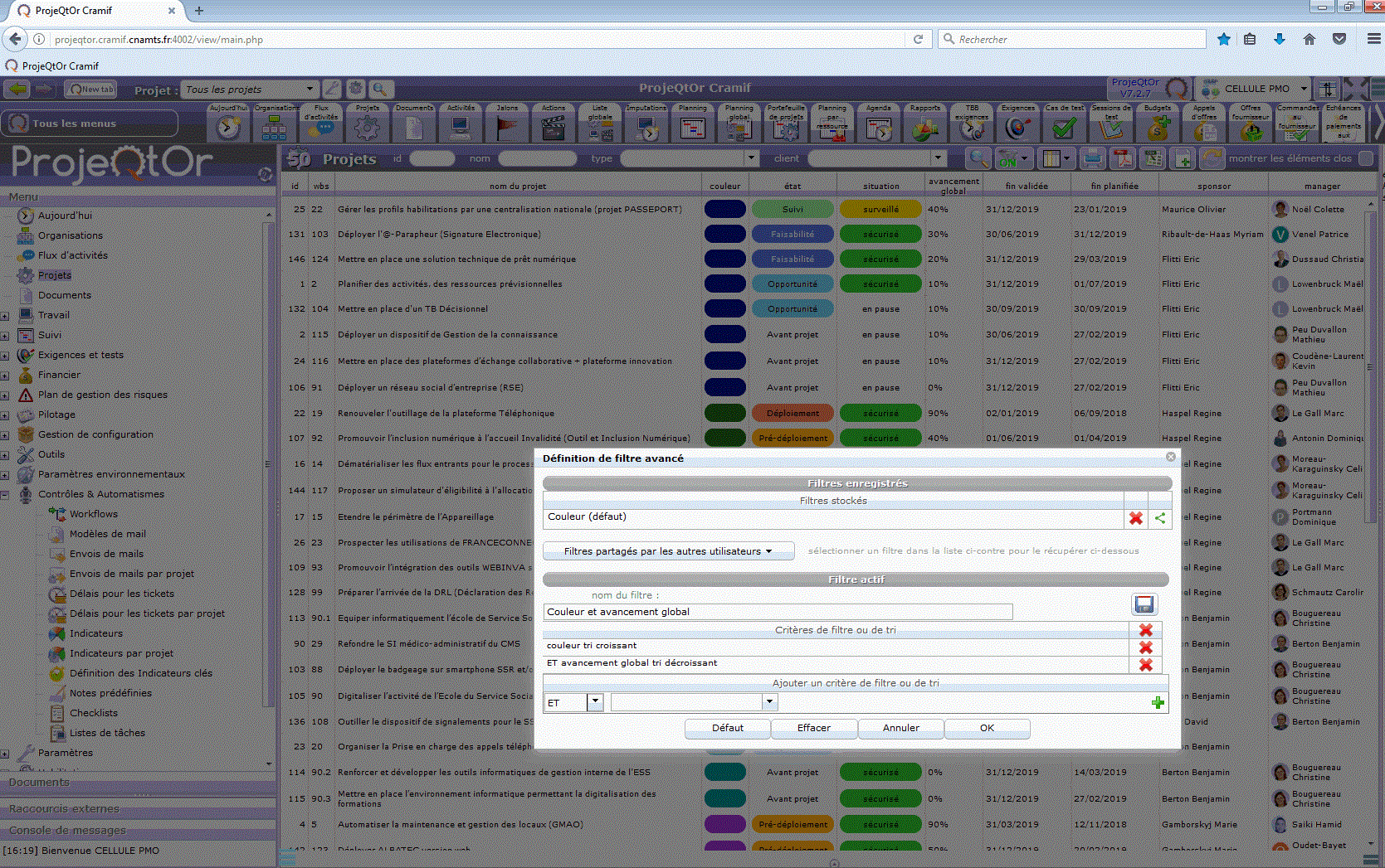 I use a filter to sort my project list, with 2 arguments (2 criterias. first sorting ascending on column 1 "couleur" AND then sorting descending on column 2 "avancement global"). The attached image shows the result. It works fine.